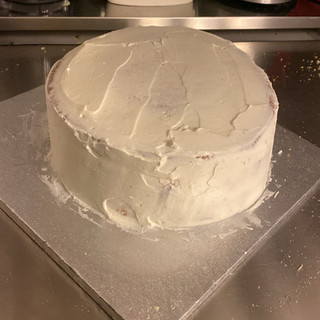 5-Coprire l'intera torta di frosting alla panna. ( io a questo punto, ho decorato la base con dei biscottini Oreo, ma voi potete usare ciò che preferite)