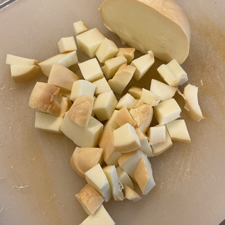6-In una ciotola tagliare la mozzarella e la scamorza a cubetti e aggiungere i ciuffi di basilico fresco