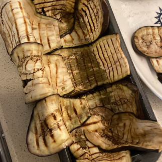 1-Tagliare a fette ( per lungo) una delle due melanzane e grigliarle in una bistecchiera cosparsa di sale fino.
