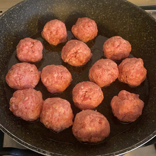 3.Dividere l'impasto in 14 polpette e sistemarle in una padella insieme a 3/4 cucchiai di olio E.V.O.